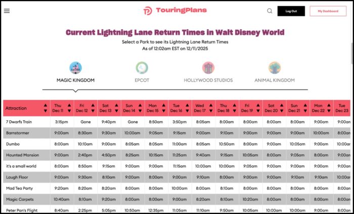 The TouringPlans website has lots planning tools to help you wait in line less during your next Disney World vacation! This might be one you haven’t used before. Did you know you can find 21 days of Lightning Lane return times on the TouringPlans website?