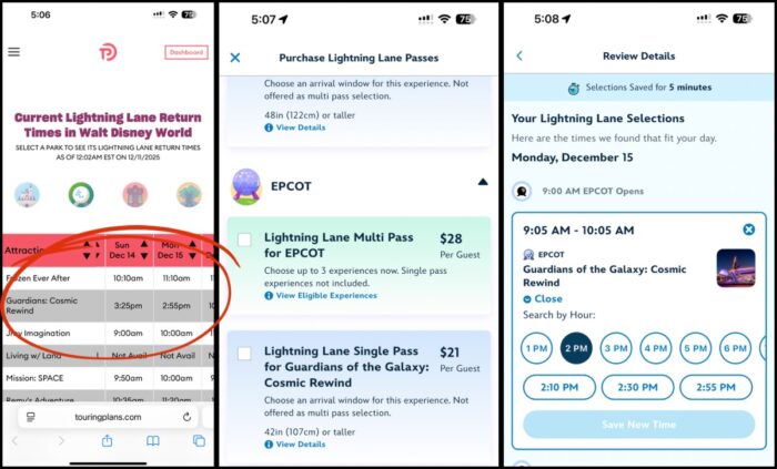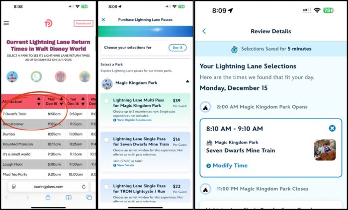 We’ll be referencing the image above for this example. Our website shows the next Lightning Lane return time for Seven Dwarfs Mine Train on Monday, December 15th as 8:50am. This is the portion of the image above that’s circled in red. The far right screenshot shows that we we able to secure a Lightning Lane Single Pass return time of 8:10am – 9:10am for the 15th.