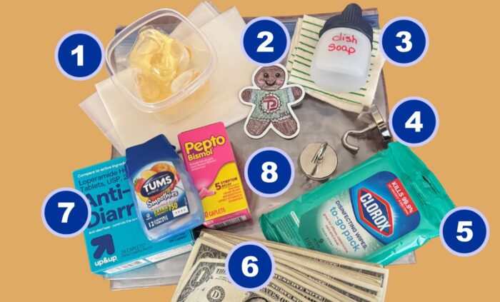 - Dish soap and a few sponges or dish cloths – if you’re bringing your own reusable water bottles or cups onboard, and you should, you’ll want to wash them at some point. Keep the sponges in a plastic sandwich bag & grab a sturdy but small container for the soap. We use a dressing squeeze bottle that can be found just about anywhere.