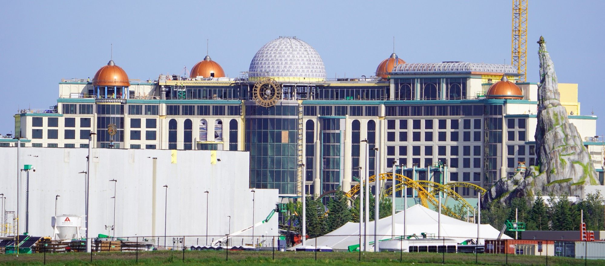 Bioreconstruct snapped some ground-level photos of Epic Universel’s tallest structures (we assume on his way to the helipad). The Epic Universe Chronons is the park’s icon located at the front of the park, the rumored Celestial Park “lore” is this device that powers the portals to the worlds in the parks. Upon entering the park through the portal under the Chronos guests see the 12-story Helios Grand Hotel as the focal backdrop of the park. The massive stone head of an ancient Kong is spotted above the trees in Super Nintendo World’s Donkey Kong Island. Water comes out of the monkey’s mouth, providing a cool illusion to the Donkey Kong Mine-Cart Madness coaster.