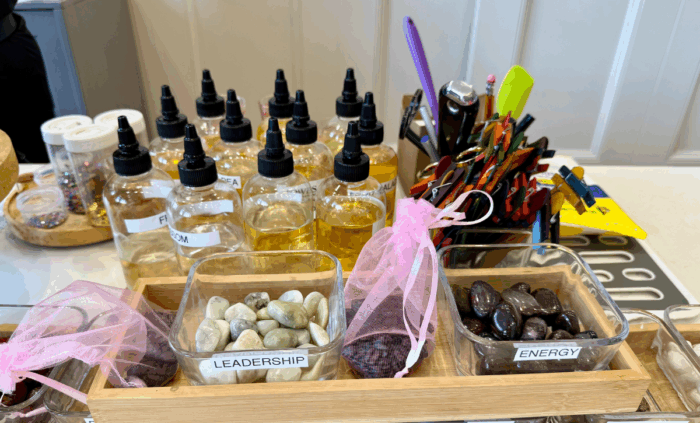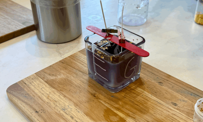 You’ll be given a clear candle base to start. You’ll set up your wick to make sure it stays in place through the wax pour, and attach your safety stickers.