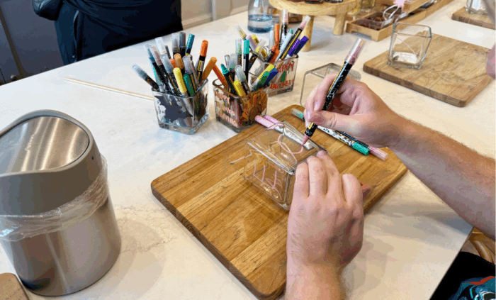 Next, it’s time to decorate the outside of your candle glass. You’ll be provided a plethora of paint markers to help you create the perfect design. Don’t feel rushed during this step – there is no time limit for this experience, and you should take the time you need to make sure you’re satisfied with your art.