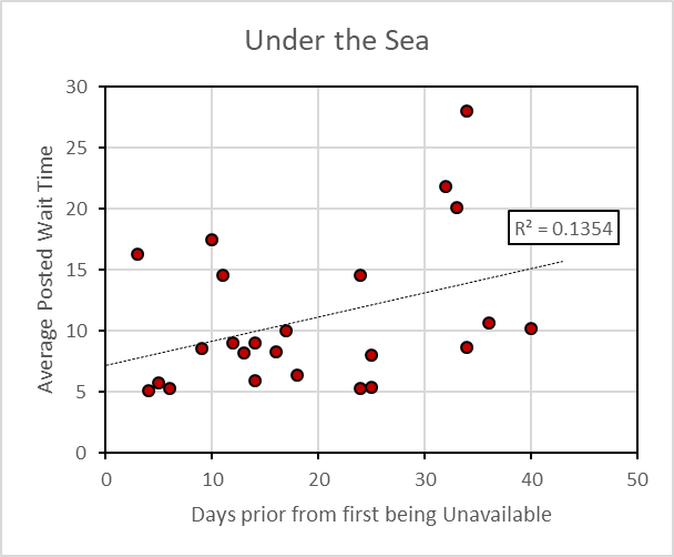 The slope of the regression line is positive on most of the charts. This supports the idea that the quicker Park Passes become unavailable, the higher the wait times. The variance is high, so the R-squared is low for many attractions. Park Passes becoming unavailable for Annual Passholders is more a function of the limited availability than demand.