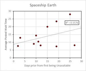 Our hypothesis is that the faster a park’s reservations sell out, the higher wait times will be, and thus higher crowd levels. Since Disney Resort Guests and Park Ticket Guests are rarely unavailable we cannot infer much from that data. Annual Passholder Park Pass reservations do become unavailable. Below are charts showing the relationship between an attraction’s average posted wait time and the number of days prior that Park Pass reservations were not first available. The R-squared (R2) statistical measure that represents the proportion of the variance for a dependent variable that’s explained by an independent variable. R-squared values range from 0 to 1. An R-squared of 1 means that all variance of the dependent variable is completely explained by the independent variable.