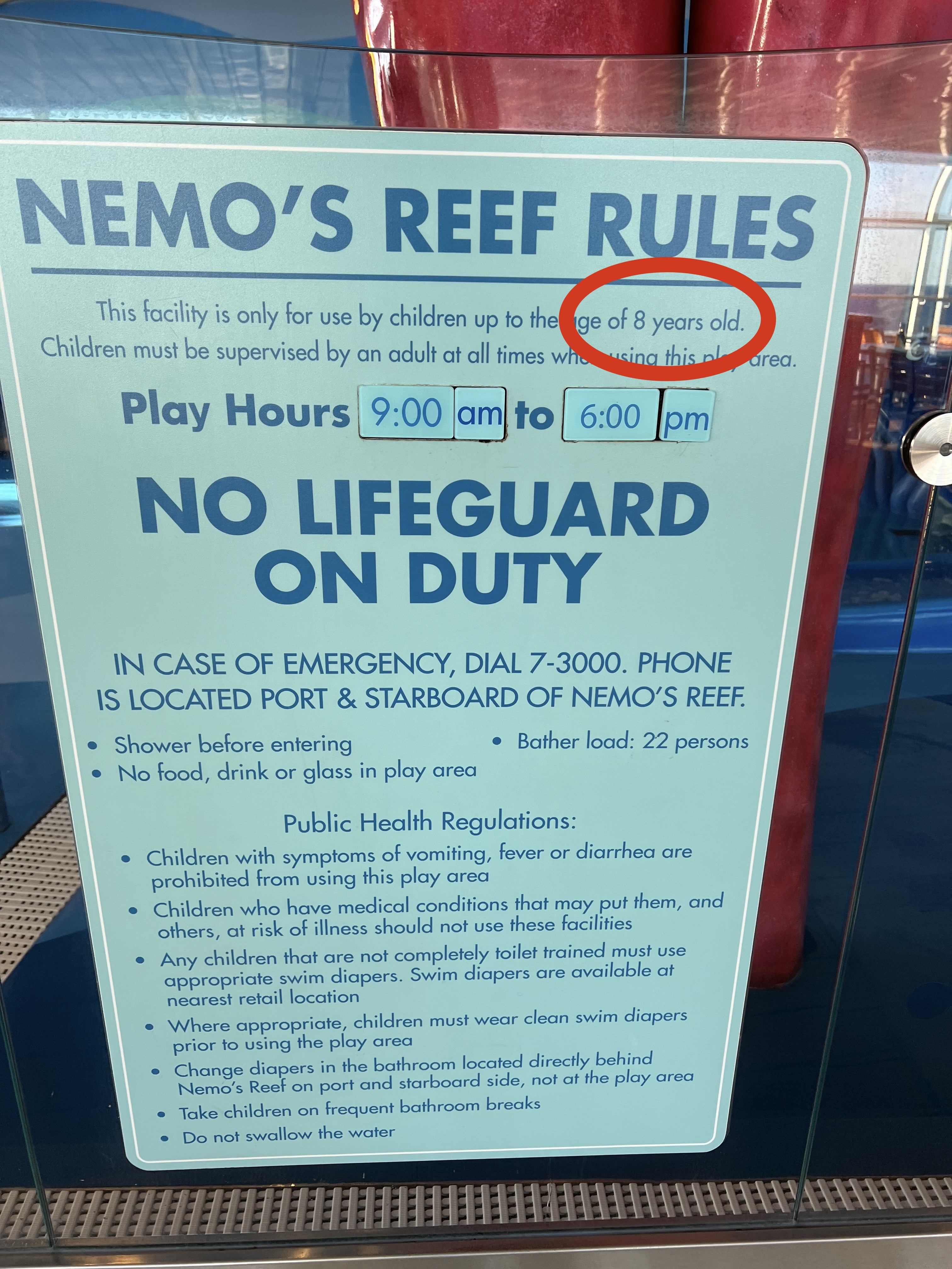 Also note that Disney contradicts itself with age requirements, particularly with regard to age limits at onboard pools. For example, signs posted at Nemo’s Reef on the Dream state that the area is for use “by children up to the age of 8 years old.” The Nemo’s Reef description on the Disney Cruise Line website states, “This attraction is intended for Guests ages 3 and under.” Where there is a discrepancy, I’ve listed the younger of the guidelines. In practice, you will have to follow the instructions of the cast members onboard the ships, regardless of what the website or posted signage states. Click photos to enlarge.