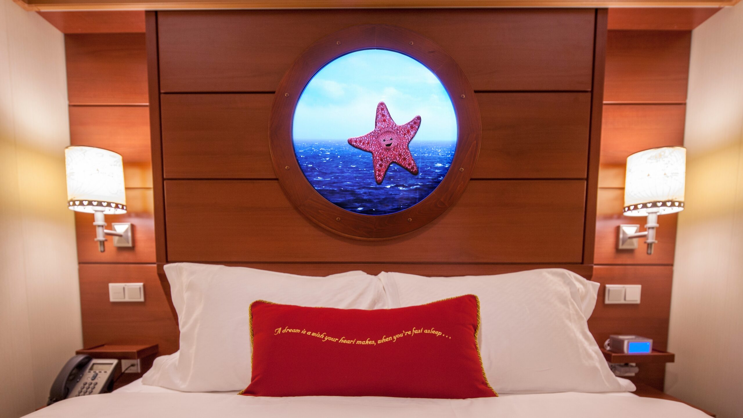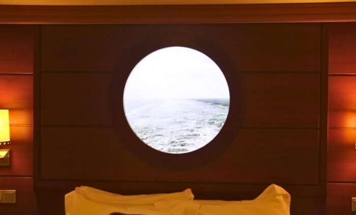 On Disney Cruise Line, some inside staterooms include a Magical Porthole. Since inside staterooms don’t have windows, a porthole-shaped computer screen stands in to give a view similar to looking out a window. Sometimes called Magic Portholes, or virtual portholes on other cruise lines, you’ll find these on most inside staterooms on the Disney Dream and Disney Fantasy. Disney’s other ships, including the newest Wish, Treasure, and Destiny, don’t have this feature.