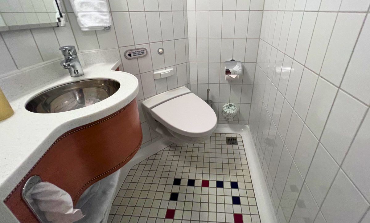 On the toilet side, shown below, you’ll find a toilet and sink, along with a mirror and a few shelves for toiletries you’ve brought with you. A hand towel and tissues will also be found in the toilet half of the split bathroom. At least one side of the split bathroom will also have a sharps container; I find it’s often on the toilet side.