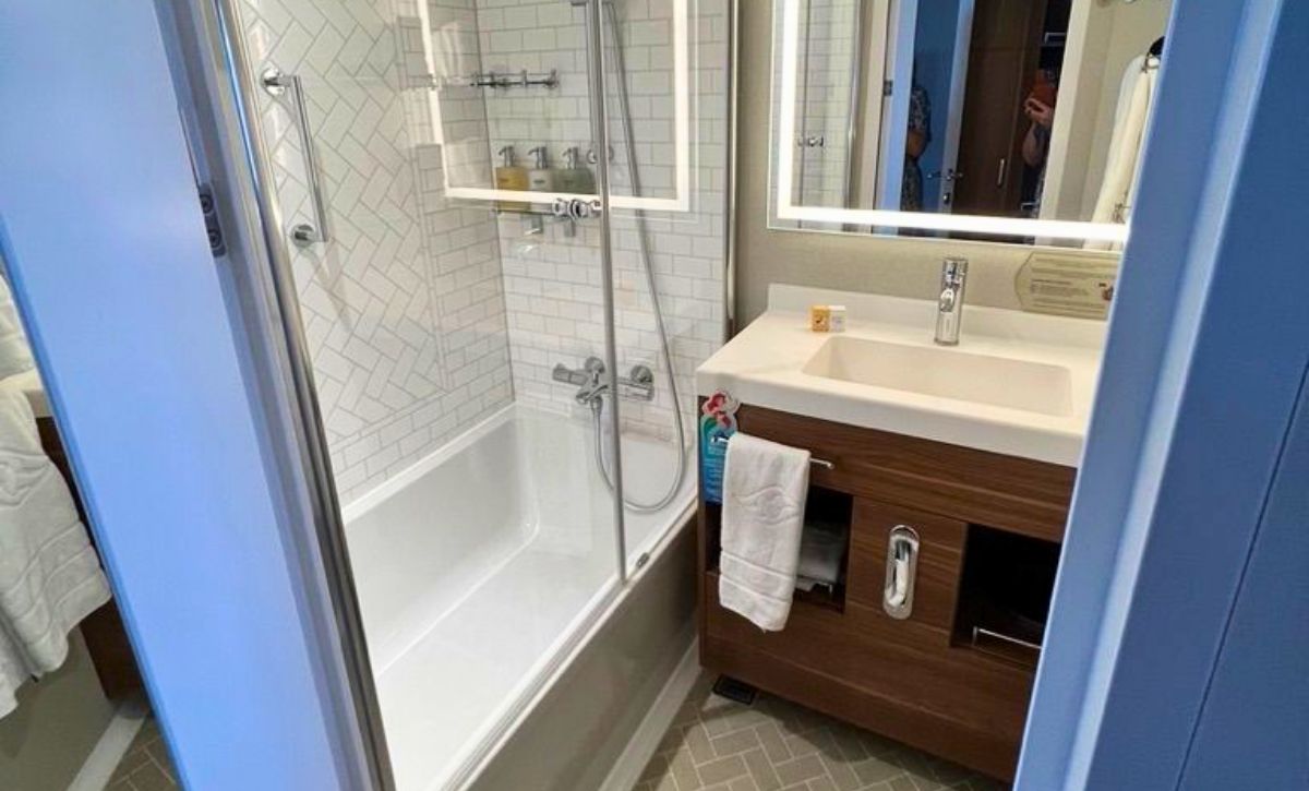 On the tub side, shown below, the typical setup includes another sink/mirror combo, more toiletry shelves, and of course, the tub. The shower is an overhead fixture with a detachable head that can be used as a hand shower; you’ll find shampoo, conditioner, and body wash all within the shower enclosure. Since this side has the bath, you’ll also find a full set of bath towels. Both sides of the split bathroom have the same decor; the picture below is from the Disney Wish, a different ship.