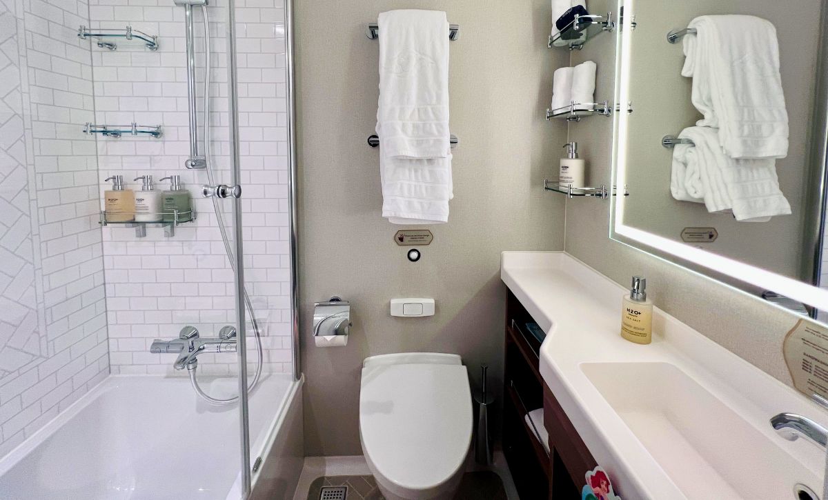Split bathrooms do exist on other cruise lines, but they’re rare; on Disney Cruise Line, they’re the norm. Your bathroom will be cleaned once a day by your stateroom host to make sure it is always shipshape.