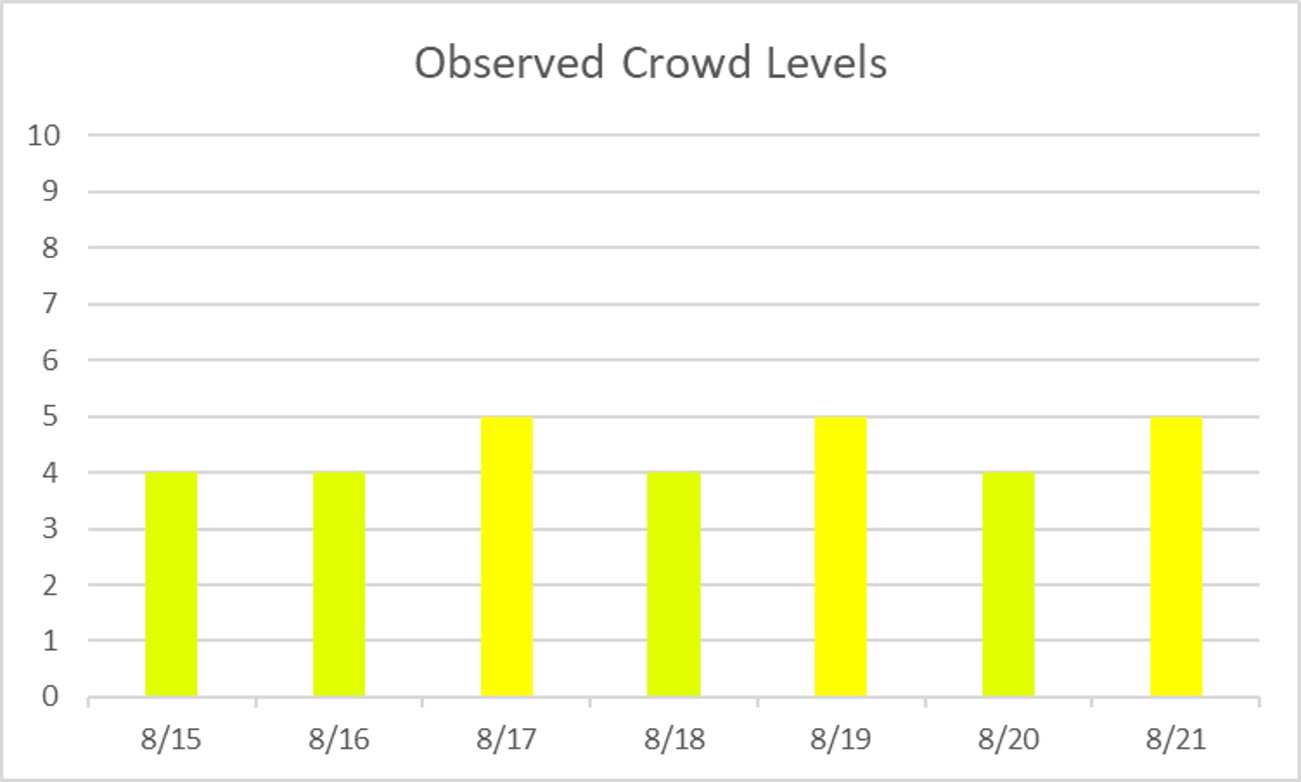 Crowds should be winding down as we head into late August and then September, but we might see one last burst of summer activity from now until Labor Day. Nothing crazy, but still in the crowd level 3-5 range.