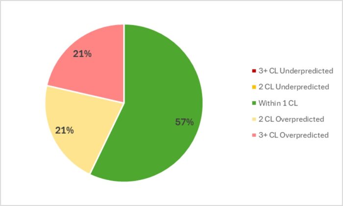 Each week, I give you a very transparent look into how the TouringPlans crowd level predictions performed. Each day at each park is one data point, so each week we have 28 different crowd level predictions to evaluate. Any time a prediction is within one or two crowd levels, things won’t really “feel” much different than what was predicted. Being off by 3 or more crowd levels is where you might feel that difference in wait times throughout the day.