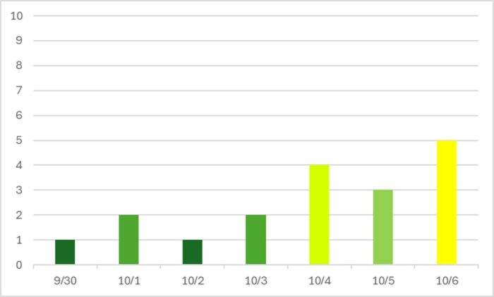 Our slow-but-steady increasing crowds for the month of September dove back off a cliff to end the month! It looks like fall break crowds waited until the first weekend in October to start showing up. How do we know this is an actual trend? Because it breaks the weekly pattern. Ever since the end of summer, Saturdays have been the most crowded day of the week. And now we’ve got a Monday that is more crowded than anything else instead. That points to families showing up in ways that they haven’t since … Spring Break season, probably.