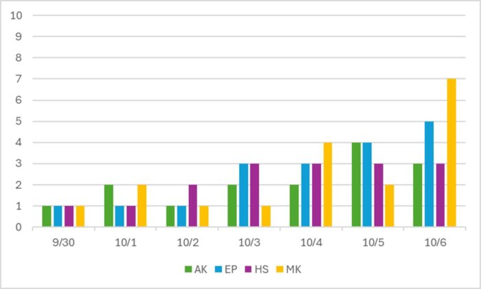 These numbers are slightly deceptive, because the past seven days were really two very different “weeks”. We have September 30th through October 3rd, where crowds were really low, and then October 4th through 6th where they came ROARING back at a level we haven’t seen since March. If we split up our data that way, our averages look like: