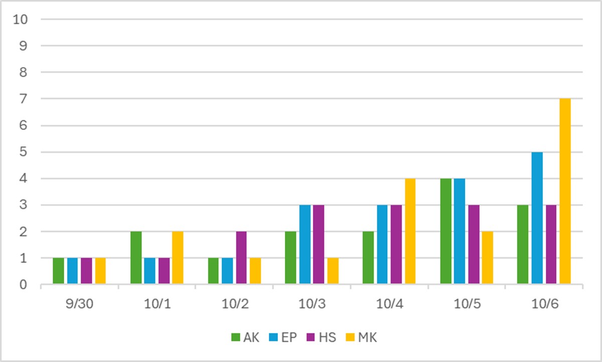 If you guessed the 30th, 2nd, 3rd, and 5th, you were correct! The difference between October 5th (party day) and October 6th (non-party day surrounded by two party days) was FIVE crowd levels. That’s a huge difference in what the park feels like and how efficiently you’re able to tour. But it’s not just Magic Kingdom with high crowds – all parks were starting to fill up more beginning on the 3rd and 4th.