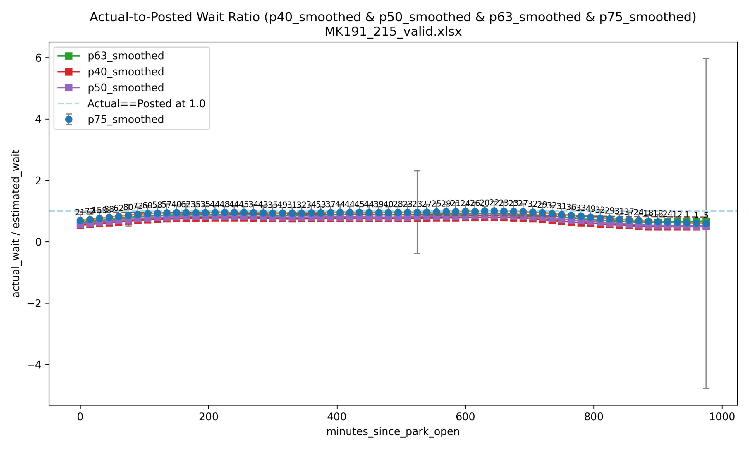 The graph’s y-axis is the average of the actual wait times we’ve received, divided by the posted wait shown on TRON’s entrance at the moment our user got in line. So if the sign said the wait was 100 minutes when our user got in line, and the user actually waited 80 minutes to ride, then the actual-to-posted ratio is 80 / 100 = 0.8. For simplicity we’ll call this “the ratio.”