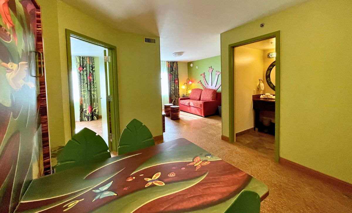Family Suites at both resorts use convertible furniture to deliver the extra beds. At the All-Star Music suites, the second room has a table and sofa that both convert to queen beds. For Art of Animation’s suites, there’s a separate dining area with a table-bed and a sofa bed in the living room area.
