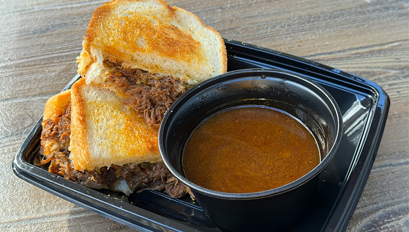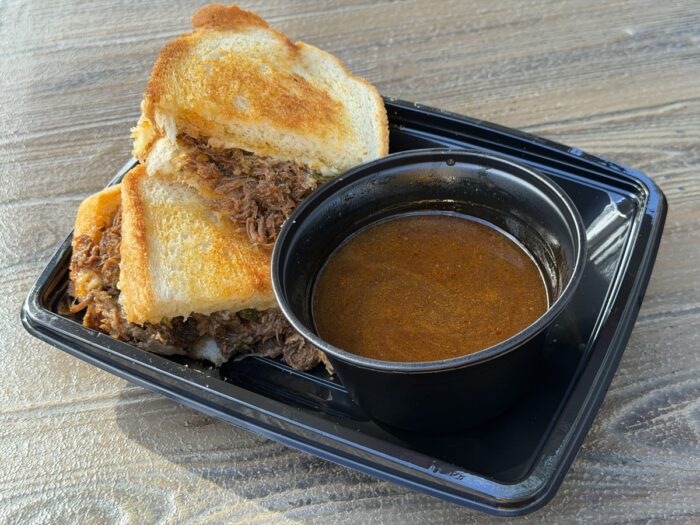 The Beef Birria Toasted Cheese ($15.49) includes pepper hack, onion, cilantro and salsa verde on sourdough bread and served with consomé for dipping. The beef birria is rich and savory and has a slight kick to it. It’s a greasy mess but it’s also darn good.