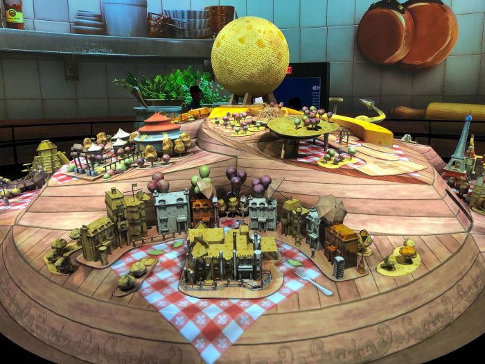 Outside the theater, there are food stations (that are currently unavailable), seating areas, bathrooms, and EPCOT-centric photo-ops, posters, and concept art.