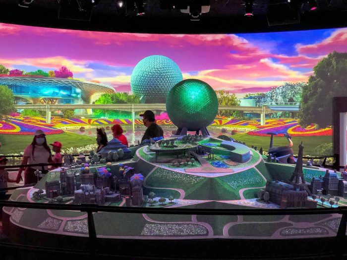 Guests entering the center theater will find a huge diorama of EPCOT that’s transformed by projections in conjunction with the presentation film displayed on the surrounding 360-degree screens.