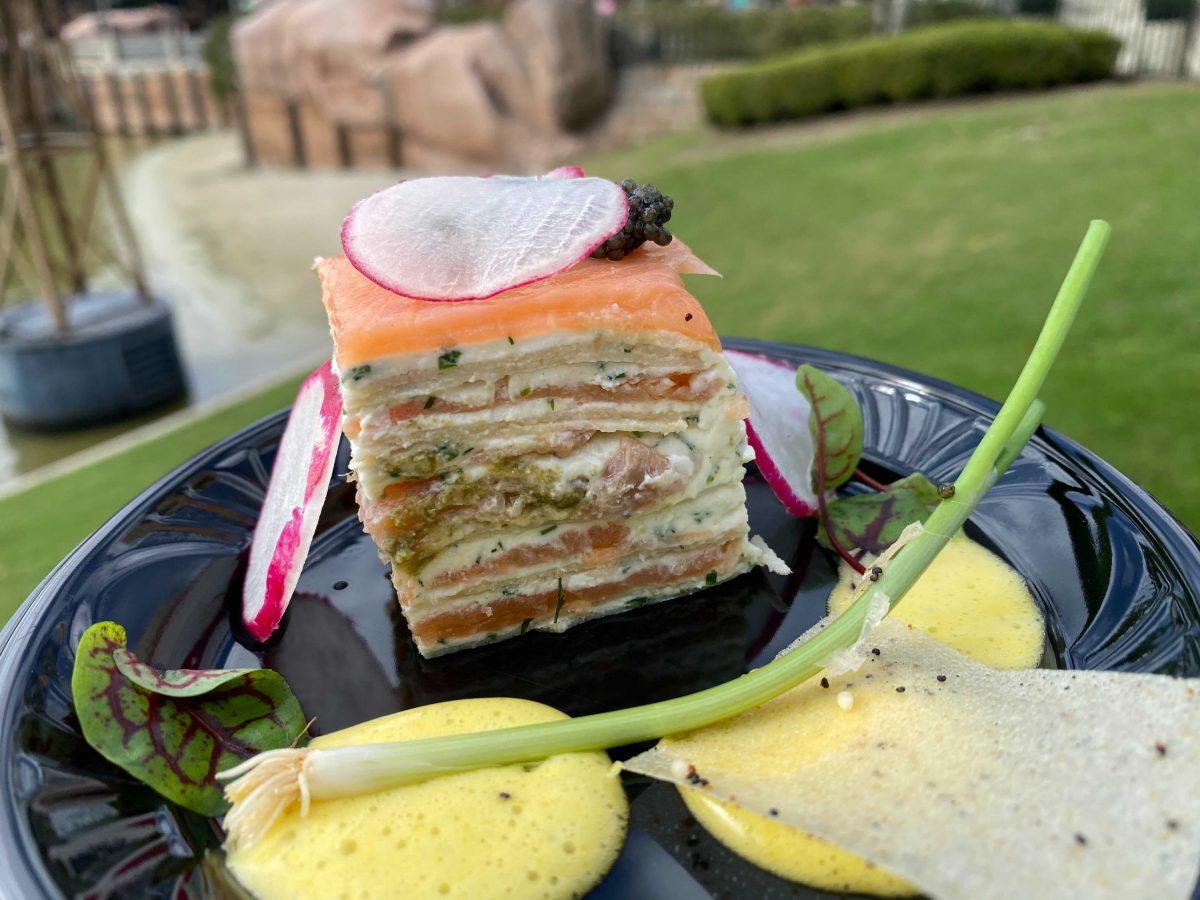 - Salmon and Cream Gâteau with Egg Yolk Cream, Paddlefish Caviar, and Micro-Herbs – $7.00