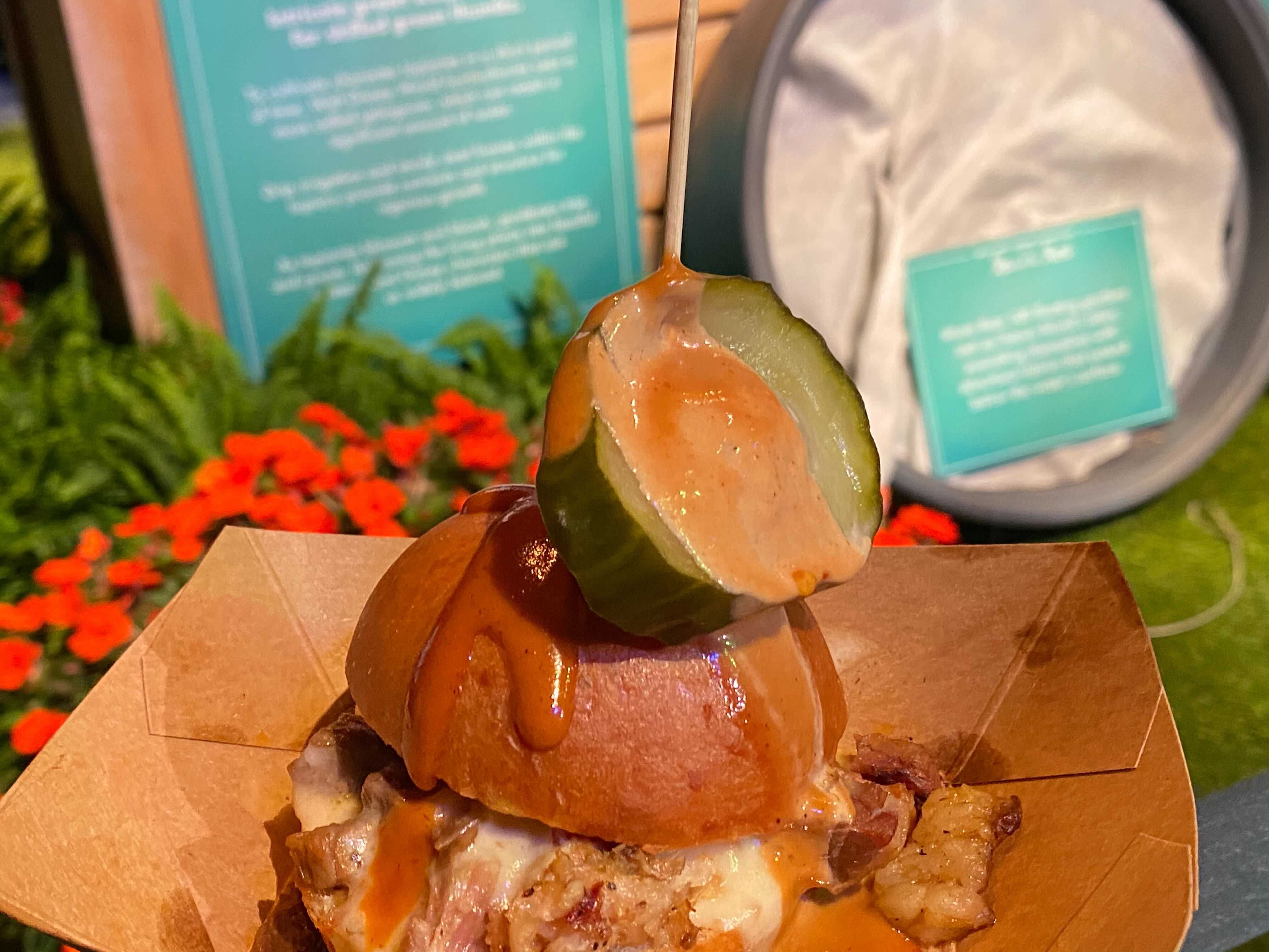 - Beef Brisket Burnt Ends and Smoked Pork Belly Slider with Garlic Sausage, Chorizo, Cheddar Fondue, and House-Made Pickle – $7.50