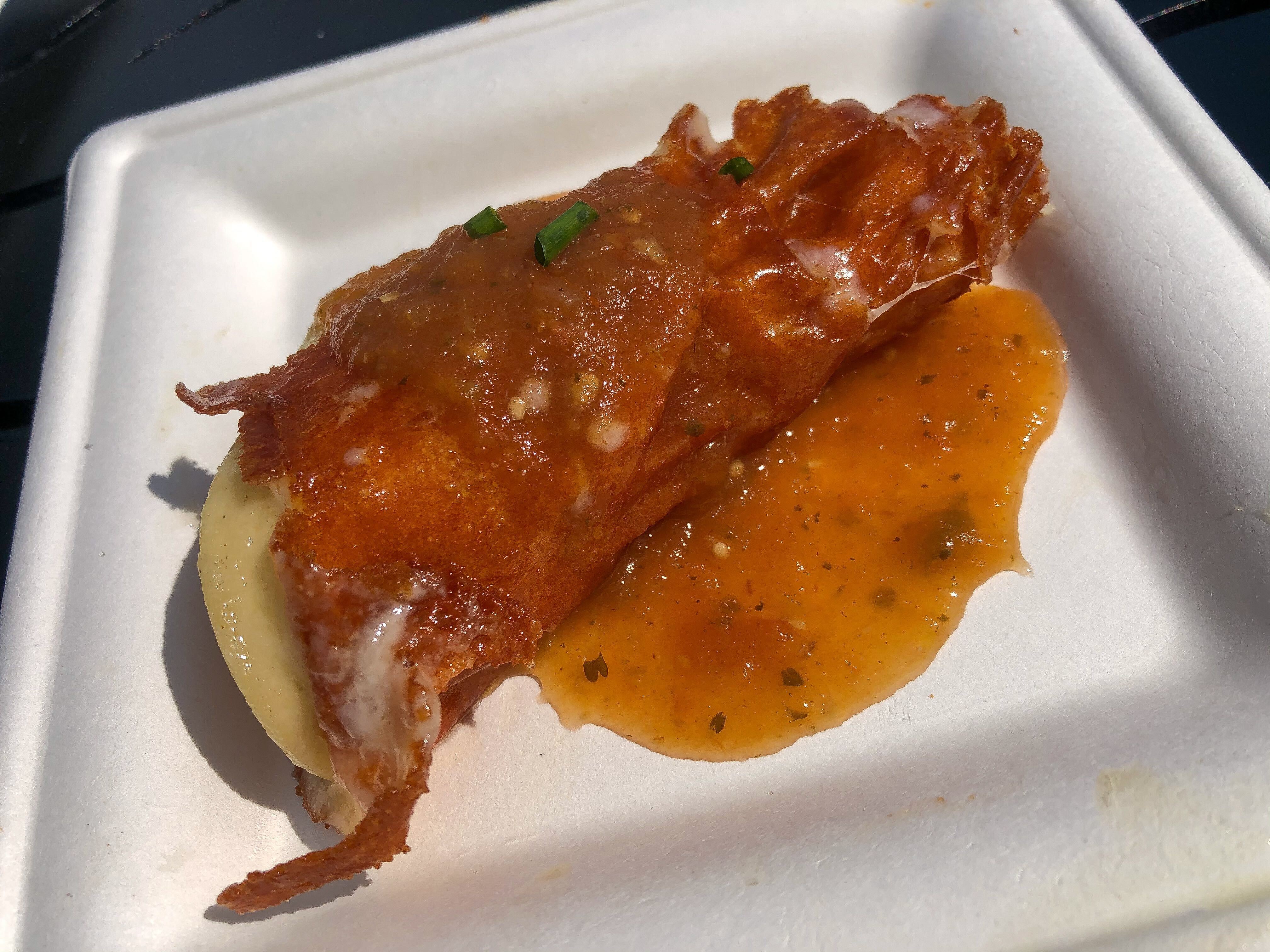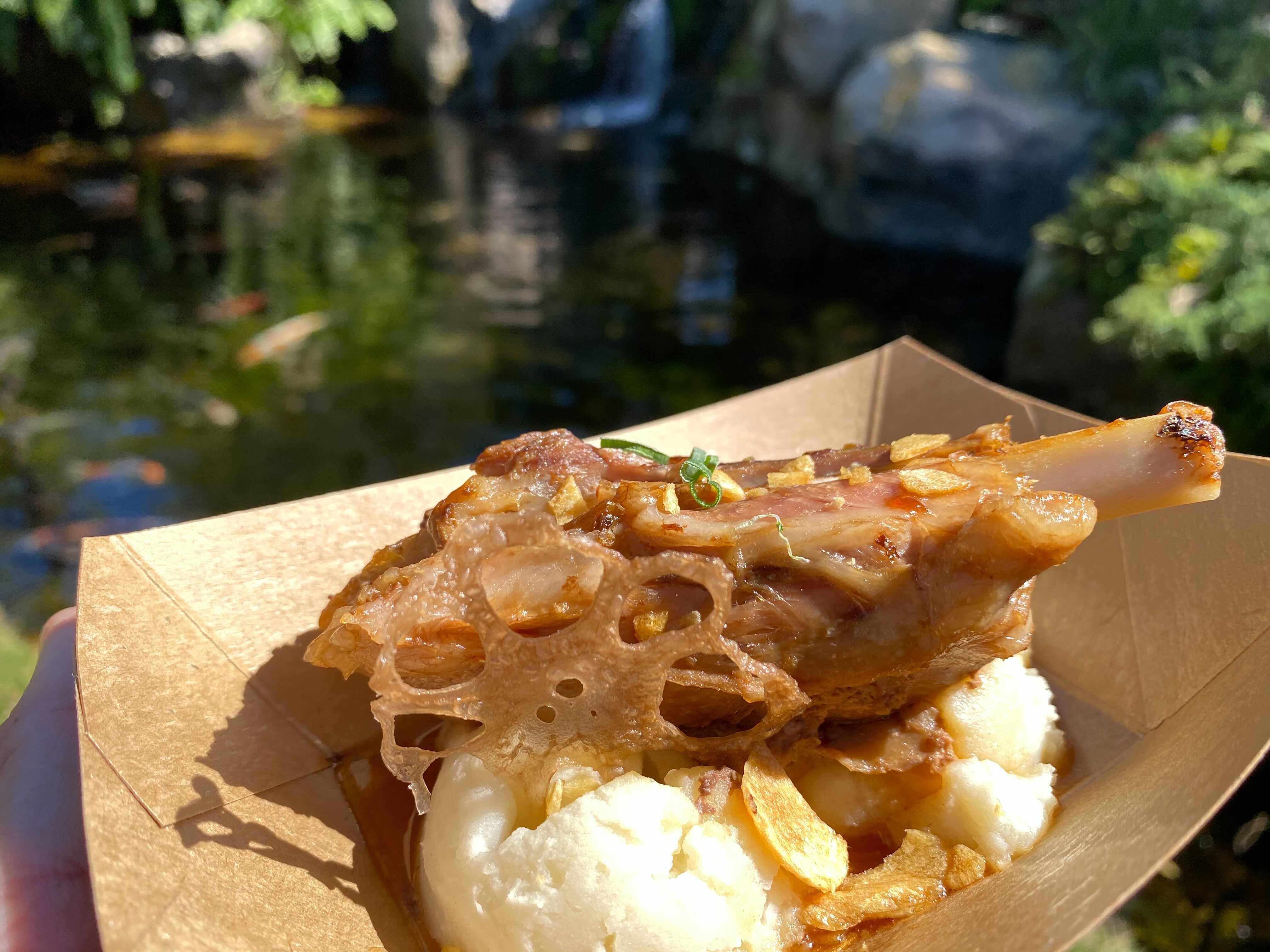 - Soy-Glazed Pork Shank with Truffle Mashed Potatoes, Crispy Lotus Flower, Garlic Chips, and Green Onion – $7.00