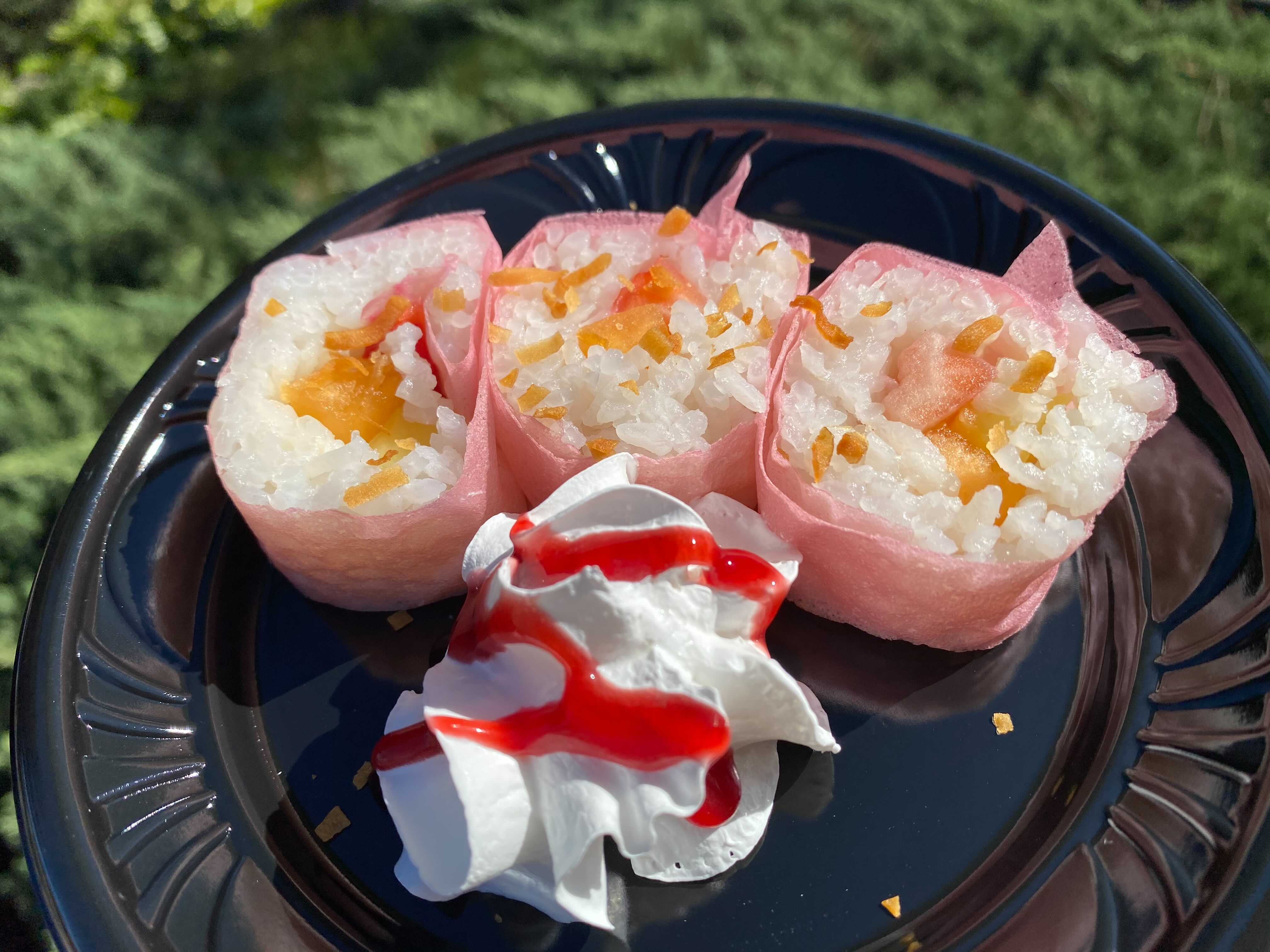 - Frushi: Strawberry, Pineapple, and Cantaloupe Wrapped in Sweet Rice and Pink Soy Wrap served with Whipped Cream, Drizzled Berry Sauce, and Toasted Coconut – $6.00