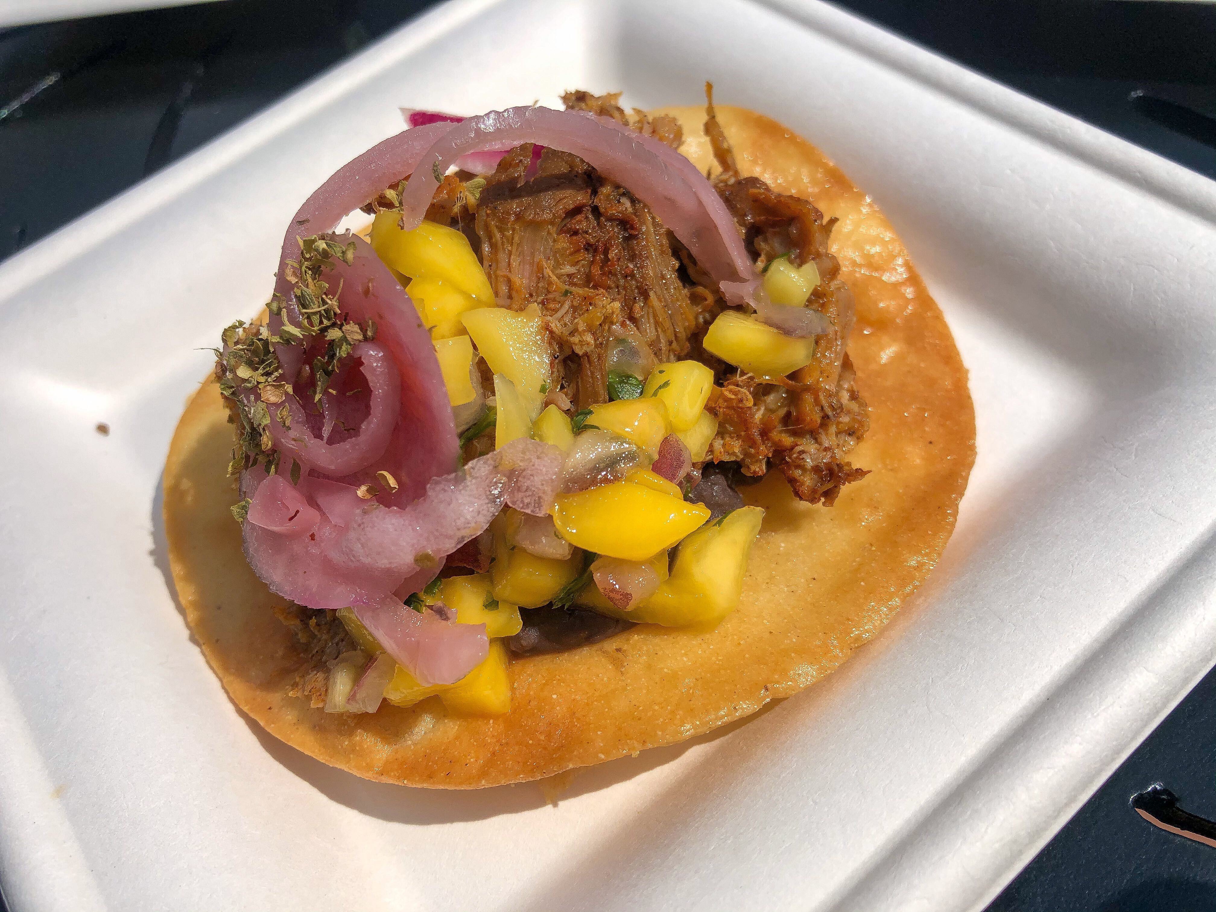 - Tostada de Cochinita: Braised Pork on a Crispy Corn Tortilla with Black Beans Topped with Pickled Onions, Mango-Habanero Relish, and Oregano – $7.00