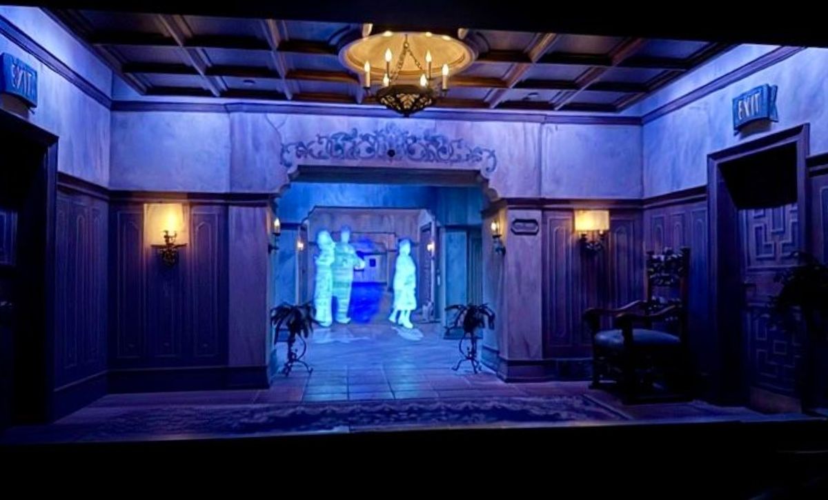 Once through the lobby, your journey begins in earnest. It’s into the boiler room where you’ll board the service elevator. Mr. Serling’s narration continues as your ride vehicle takes you upstairs. When the doors open, you’ll see the ghostly victims of the lightning strike.