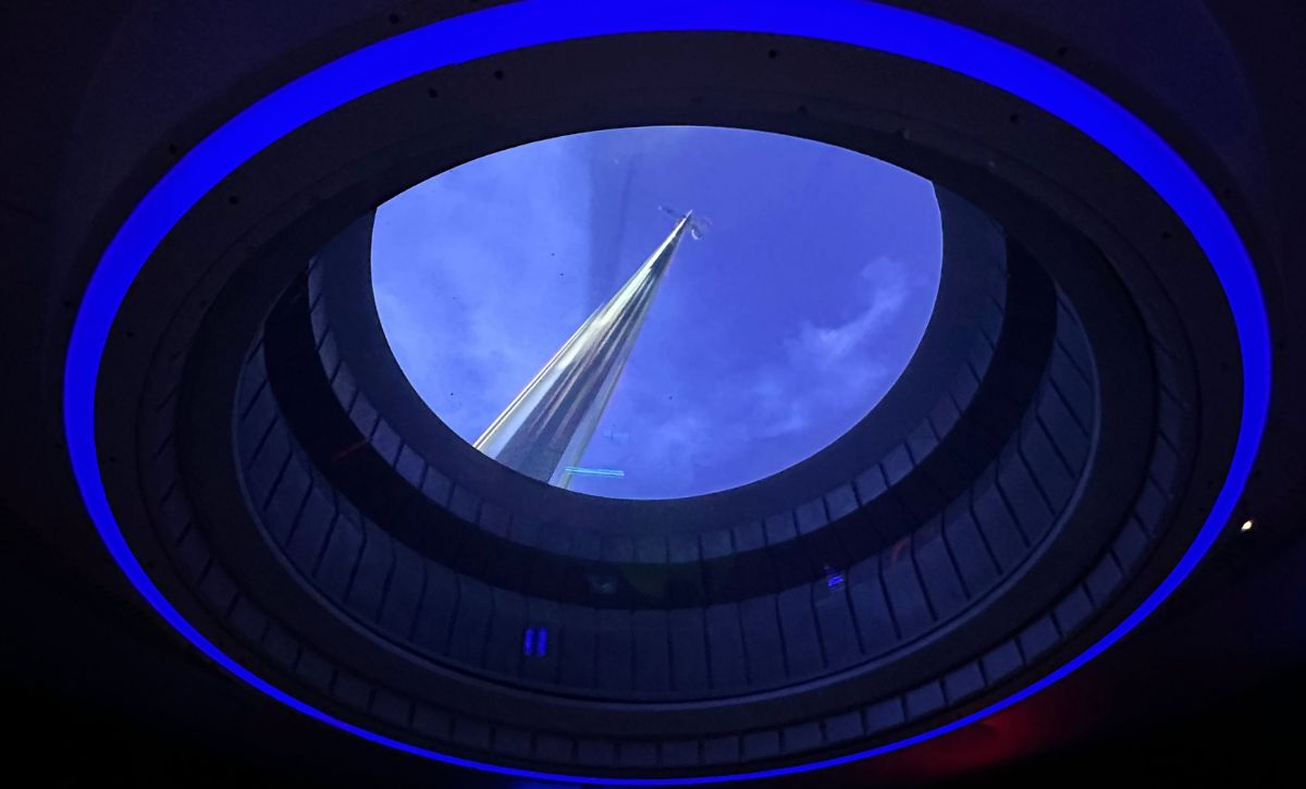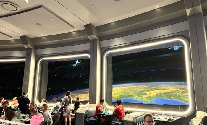 You ride up to the dining area via a “Stellarvator” to arrive in a dining area that surrounds you with screens/windows for an immersive experience. You look down at the Earth as you orbit and eat.
