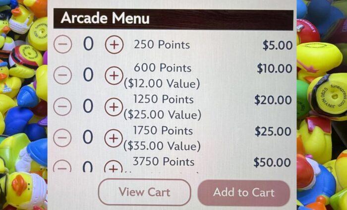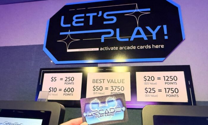 The image above shows the dollar to point breakdown for a Play Card. These prices and point values are going to be the same in every resort arcade. I can say with some confidence that you’re going to want more than 250 points but probably won’t use 3750 points unless you’ve got a gaggle of folks with you or you’re planning to spend a lot of time at the arcade.