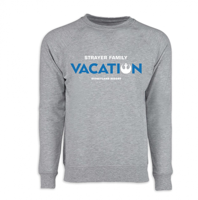 Right now ShopDisney is offering several Star Wars-themed designs that can be imprinted with your family name. The garment choices include sweatshirt, long-sleeve tees, and short-sleeve tees in sizes for men, women, and children, sometimes in a range of colors.