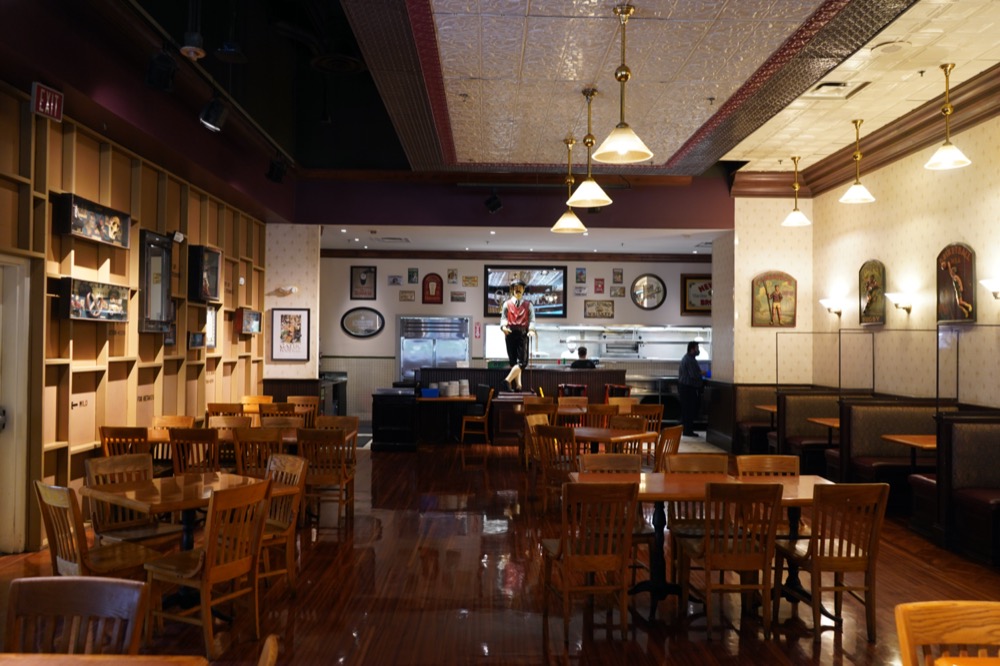 Situated behind the false facades of the New York Backlot section of the park, Finnegan’s is one of the park’s two sit-down restaurants. The interior, inspired by the 1978 film The Brinks Job, replicates a film set with incomplete walls where cameras would be placed. The main dining room features wood flooring, tall ceilings, white walls, and wooden sports plaques on the walls while on the bar side is covered in Guinness posters and features a room-length carved, wooden bar.
