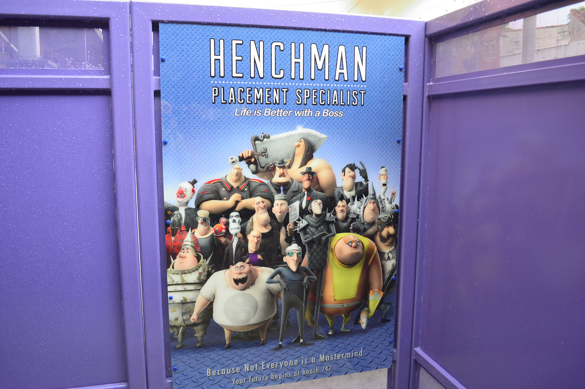 Inside the sound stage is a sample of the Villian-Con convention floor full of vendor displays. Imagine a parody of the Consumer Electronics Show company booths where various wares are hawked, from the newest gadgets to villainy planning services.