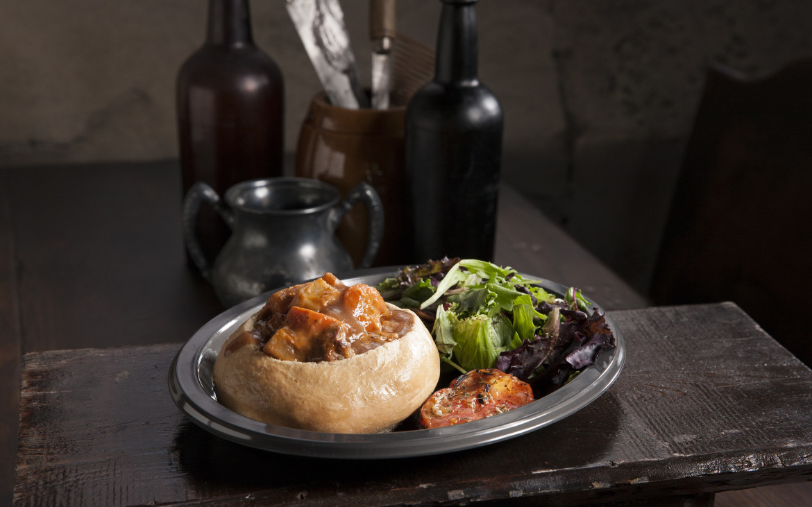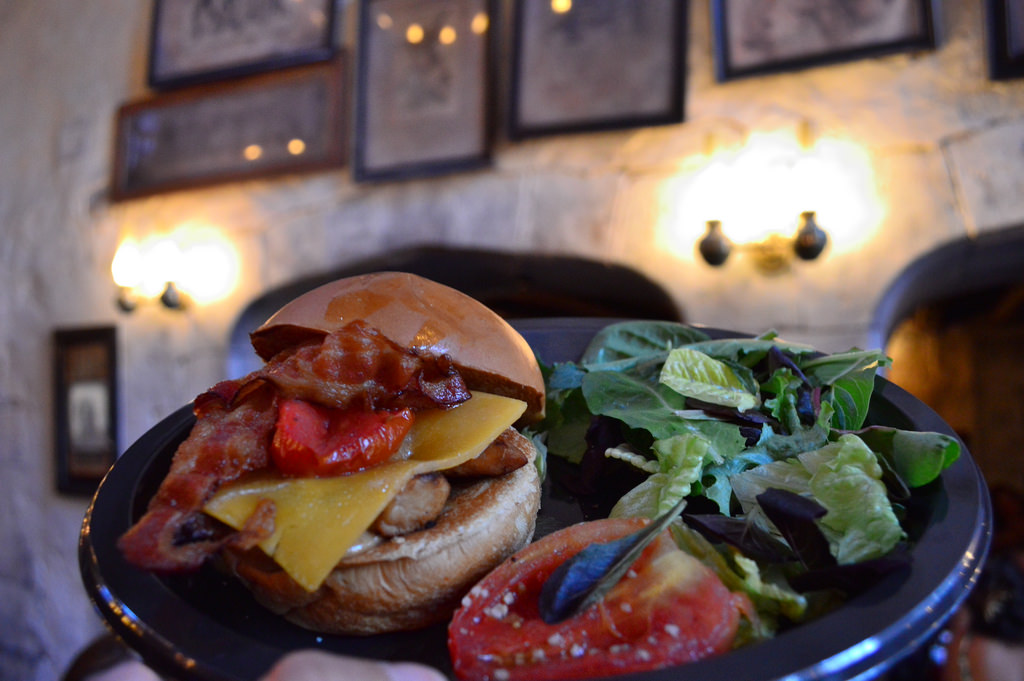 Leaky Cauldron features fresh British pub food such as fish and chips, stews, meat pies, and sausages. Entrees come with a side of either salad, vegetables, or potato wedges. The star of the menu is the Ploughman’s Platter, a feast for two including salad, several types of cheeses, crusty bread, and fried Scottish eggs. For less-adventurous eaters a grilled chicken breast sandwich is available; do not expect to find burgers or chicken tenders here. Kids options include fish and chips, mac and cheese, and a mini pie.