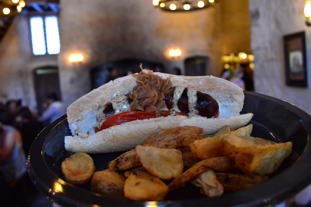 As with all Wizarding World locations, no Coke products are offered. Instead, totally unique and new drinks were created for the land and this restaurant. The famous Butterbeer is offered in frozen and cold varieties along with Tongue-Tying Lemon Squash (fizzy lemonade), Otter’s Fizzy Orange Juice (fizzy OJ), Peachtree Fizz Tea (fizzy peach tea), and Pumpkin Juice on tap (fizzy apple juice with pumpkin spices–notice a trend?). If you are adventurous try the boba Fishy Green Ale with flavors of mint and blueberry boba.