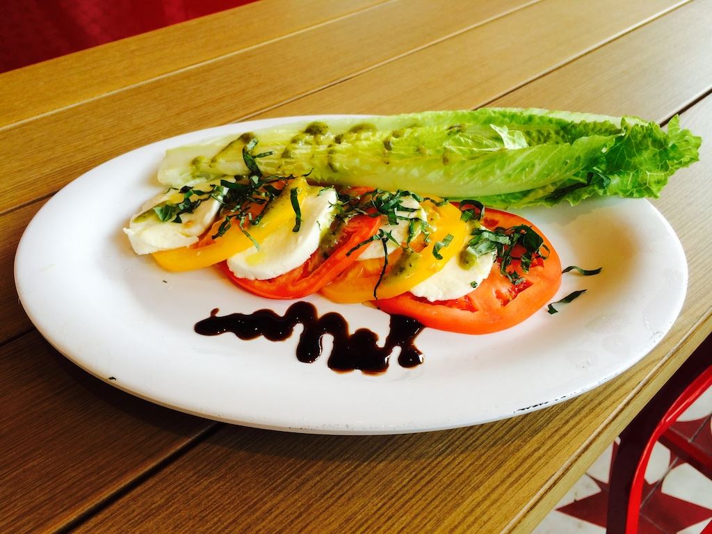 The decorations and theme are minimal but modern, featuring Roma tomato cans, bottles of wine, and white tile. Outside tables and chairs are wooden with bright highlights of red.