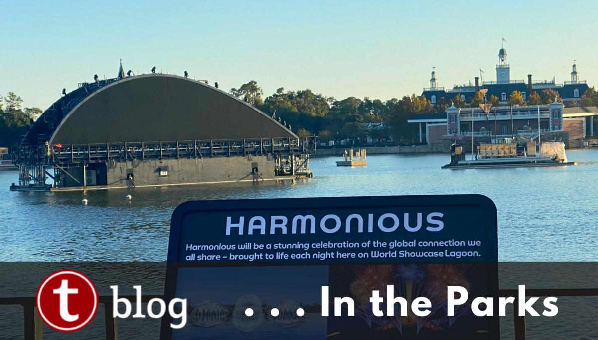 Although EPCOT currently remains without a nighttime spectacular due to COVID, work continues to plan for the debut of the new nighttime show Harmonious. Recently, it was announced that this show will be unique in that the massive barges for the show will also be stationed out in World Showcase lagoon during the day for fountain effects. This week, those barges started to move to their locations in World Showcase lagoon, and signage was added to start the massive hype for this show.