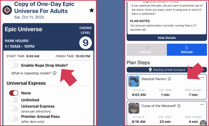 - Press “Enable Rope Drop Mode” after you’ve set your date and start time. If you do not select Rope Drop Mode, your plan will not send you to Ministry first, and you’ll risk not riding unless you’re cool with 3-4 hours in line.