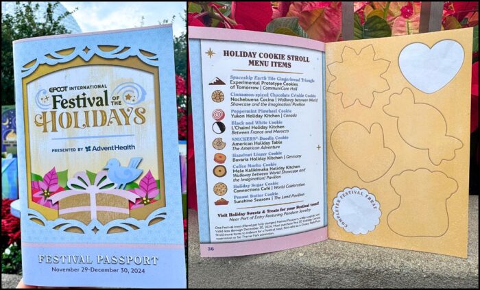 Step 1, Obtain Festival Passport & flip to the back: they’re free and they’re everywhere. You can find Passports at both EPCOT entrances, at each of the outdoor kitchens, and almost all EPCOT merch locations. The back two pages will have your Cookie Stroll menu showing qualifying cookies and the page where you’ll get your stamps.
