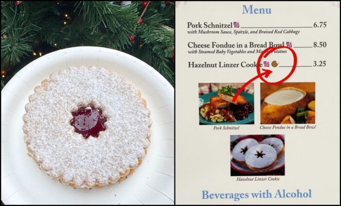 A few notable price increases from 2024 include the Linzer cookie at the Bavaria kitchen. This cookie was $3.00 in 2023, $3.25 in 2024, and is $3.75 this year. While the center stamp used to be a star and is now shown as a Mickey head, it does not appear that anything else about this item has changed. Since this is always our favorite cookie of the Festival, we’re going to cautiously ignore the 25% increase in the last two years and just smile through the powdered sugar. Additionally, the Black and White cookie at L’Chaim! holiday kitchen was $3.00 in 2023, $3.25 in 2024, and is now $4.00 with one caveat! The cookie used to be the traditional round shape and is now a Mickey head. Is that worth the 33% increase since 2023? Since both cookies with the biggest price hikes have also changed from plain shapes into Mickey ears, it looks like we have to pay the premium to get prettier content for our socials. Sold.
