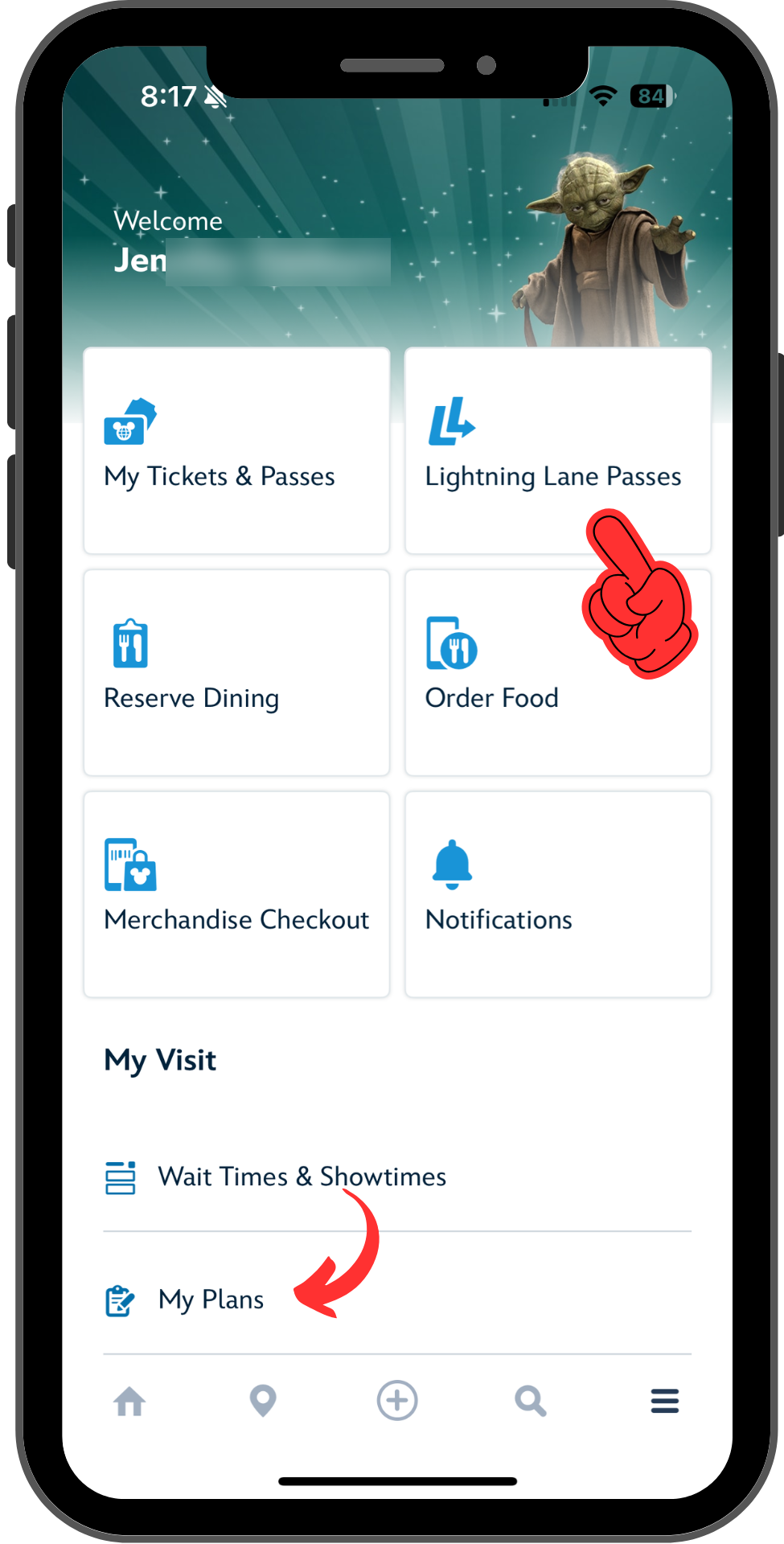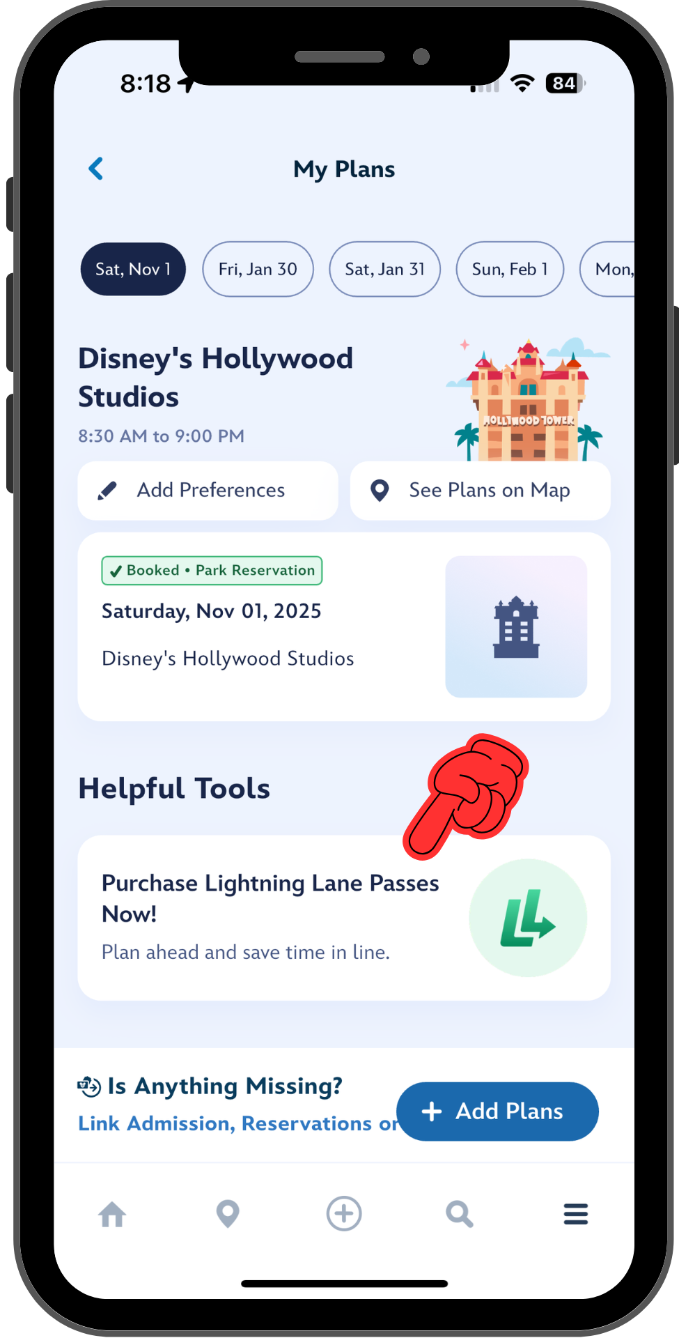 Once you’re set, you’ll see that you can begin purchasing Lightning Lane Passes from many places in My Disney Experience. (Disney is happy to take your money – they want to make sure you can find it.) Three common locations are a banner on the Home screen, a dedicated Lightning Lane Passes tile on the Tile Screen (tap the hamburger icon on the bottom to get here), or the My Plans screen.