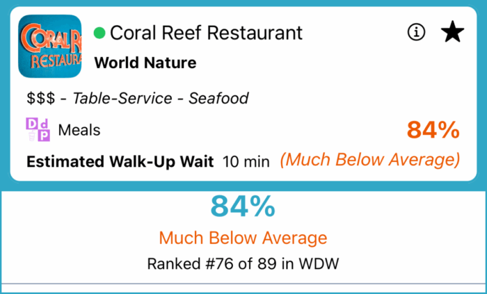 Coral Reef is currently ranked #76 of 89 table service locations in WDW with an 84%, Much Below Average, rating. This isn’t a clear rebuke of this location, at least from TouringPlans subscribers who also fill out our trip surveys. Here are a few comments from some of our readers: