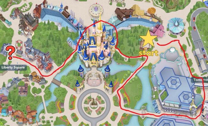 R, R: From there, they make a right toward Tomorrowland and turn right again as they head toward the bridge as shown in the image above.