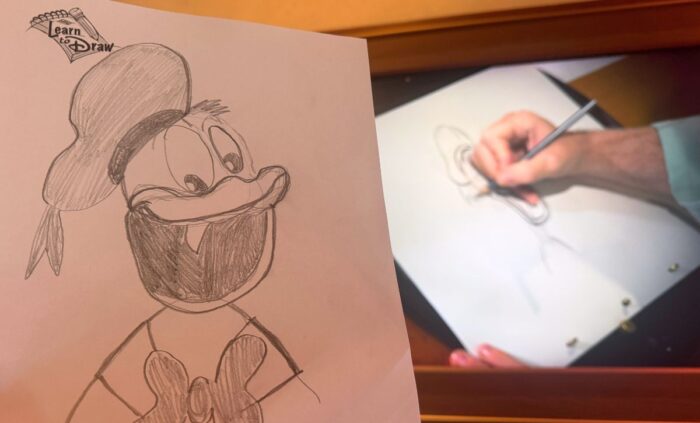 Disney Cruise Line offers opportunities to learn from real animators several times each voyage. The experience is similar to the one coming to the Studios this summer in that it is a recording of a Disney animator taking guests through the steps. We do this on every Disney Cruise and always enjoy it. That doesn’t mean we’re good, as is evident in the rendering of Donald Duck above.