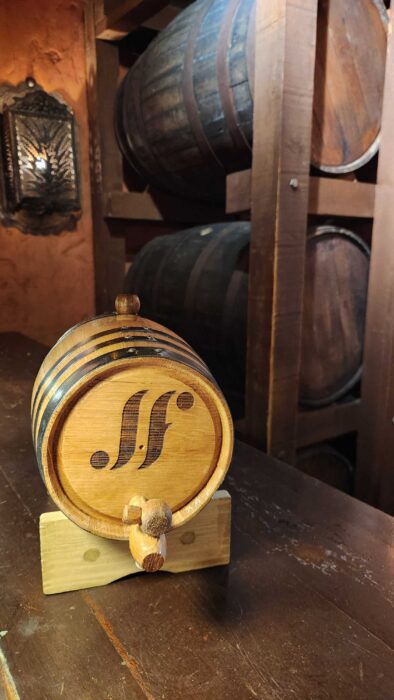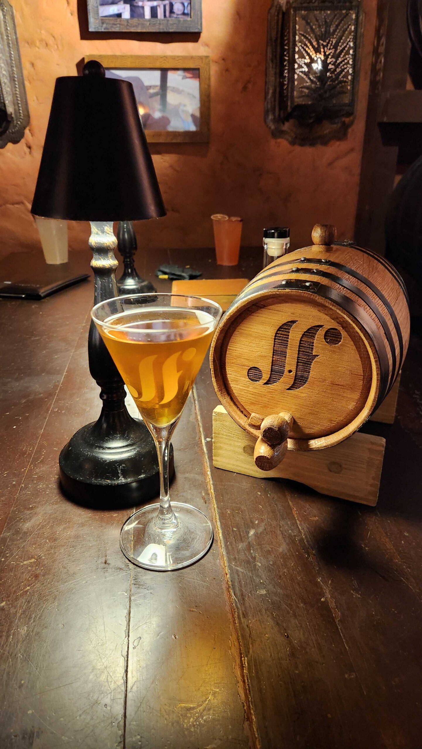 The Standing Ovation is served from a small wooden cask with a “jf” logo, and the Manhattan glass has an etching that matches. It’s a clean, cohesive presentation that is thoughtful rather than flashy.