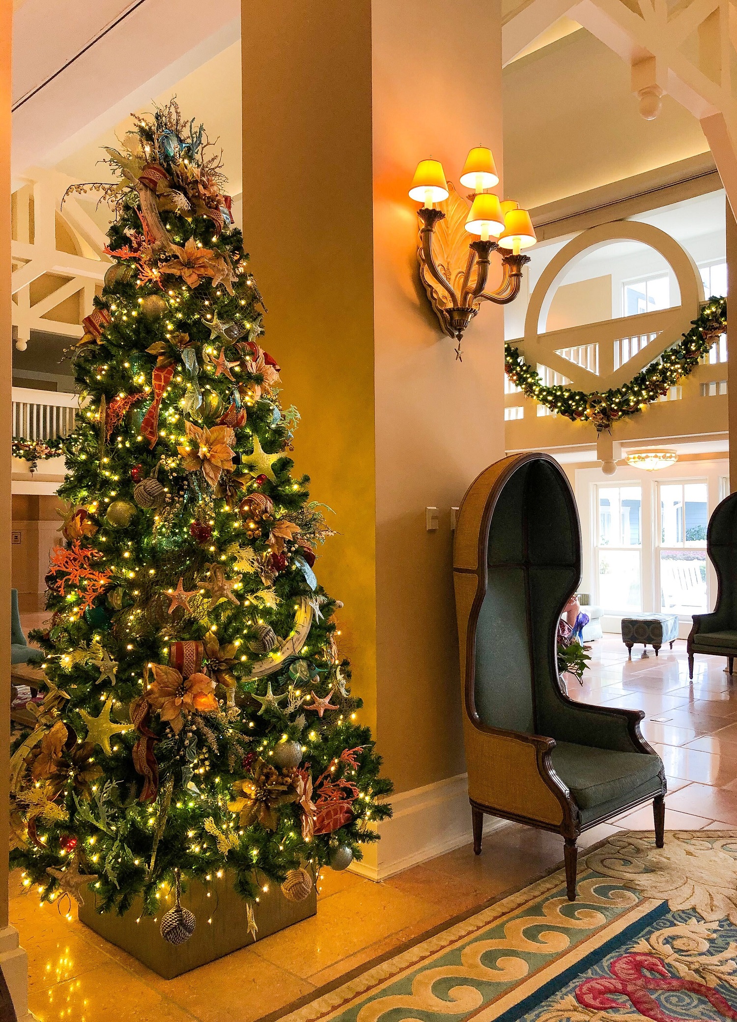 At Beach Club the decorations are full of details that celebrate the seaside and sea life. The decorations have soft pastel tones. Sea turtles and seashells are just some of the details you’ll find. There is also a miniature gingerbread carousel in the lobby in honor of the traditionally large display.