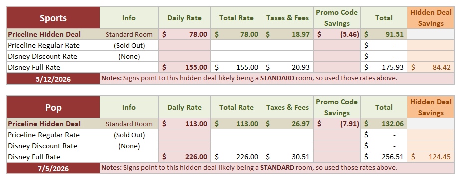 This particular set of Priceline Express deals is a bit different than previous ones – when we first found them there were significant gaps in the calendar between many 1 and 2-night deals. Some were alternating each night between different Value resorts. Typically when a set of Priceline hidden deals appear, they tend to sit as is with no changes until their dates pass – but on follow up checks we noticed some weeks in the calendar filling in with additional deals.