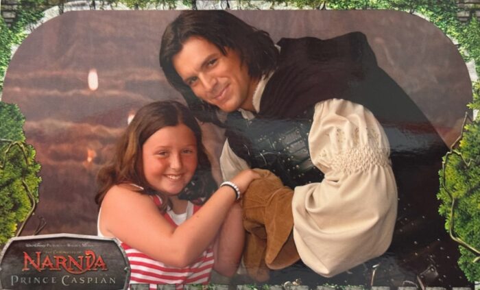 Sometimes we are gifted with a memory so sweet and so funny that the tale lasts for decades. The picture above is my niece, Katie, with Prince Caspian in MGM Studios. This child rounded the corner, saw Prince Caspian and his very shiny hair, and started to shake and cry! This meet and greet made her entire trip. Ok, so she’s now got her doctorate and is happily living in Scotland, but whatever. This is her, too, in my old brain.