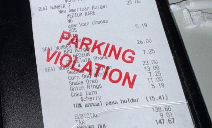 Let’s talk seating. There are some small, round, picnic-style tables at the rear, and a few regular “face-to-face” tables for larger parties. But the vast majority of the seating is in the “cars”, two across in rows. This is definitely a barrier to conversation, and if you have multiple small children who need help with their food, it could be a challenge that would make the picnic tables a better option for you. Our party was two adults and two teens, and we were happy to relegate them to the backseat. 😉
